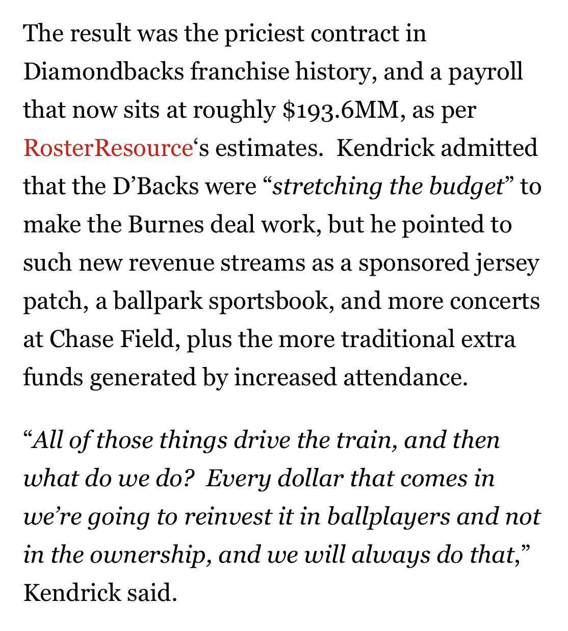 The Burnes deal was initially negotiated by Kendrick while his own Ivy-trained POBO, Mike Hazen, was out of town. Burnes wanted to be in Arizona and Kendrick decided going all-in was worth pushing past the team’s planned (and already healthy) payroll budget.