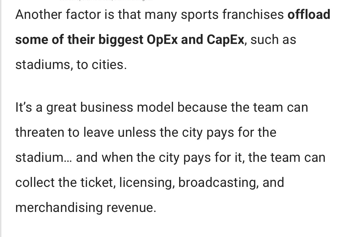 They highlighted a few key points that could be the TL;DR of this entire column. Charles mentioned that sports teams have a “protected gross margin” (due to caps or revenue sharing) over “a long horizon,” i.e.: “Predictable profitability and very stable, underwritable revenue stream.”