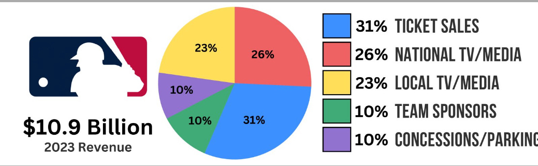 MLB teams derive a larger share of revenue from ticket sales than any other source, more so than the other “big 4” US sports: