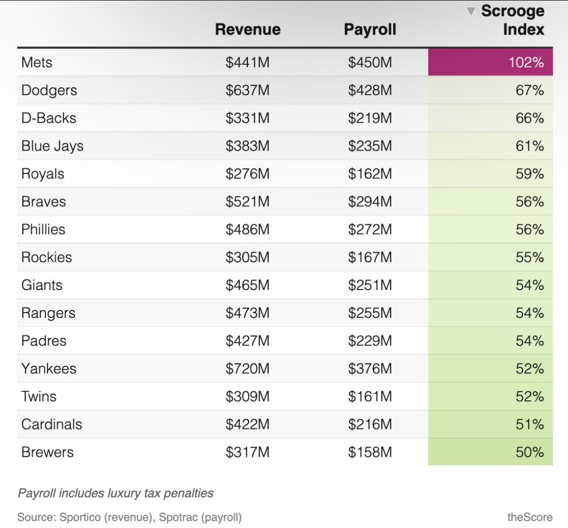 It is especially instructive when the Mets and Dodgers plow the highest percentage of baseball revenue back into player pay. We have levied the VC- or consultant-ball allegation at the Tigers but ironically, the Dodgers are owned by a financial investment firm (Guggenheim Partners) and the Mets by Steve Cohen, who made his vast fortune in hedge funds. There may not be a better poster boy for the uselessness of high finance than Cohen (who allegedly benefited from practices Christopher Moltisanti would admire and the SEC decidedly did not), but his behavior as Mets owner is both morally good and economically rational.